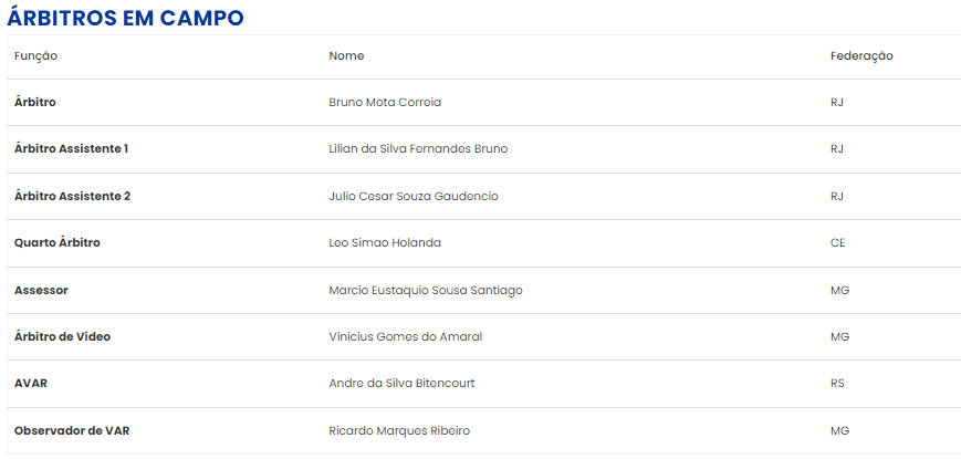 O trio que estará à frente das decisões do campo será do Rio de Janeiro. No apito estará Bruno Mota Correia, de 34 anos. Ele apitou 16 jogos nesta temporada e, no geral, foi árbitro principal em dois jogos do Vozão, o último sendo na vitória por 3 a 1 sobre o Londrina-PR, pela 27ª rodada da Série B 2023.