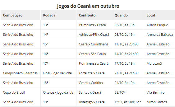 Brasileirão, Cearense e Copa do Brasil: veja a agenda de jogos do Ceará em outubro