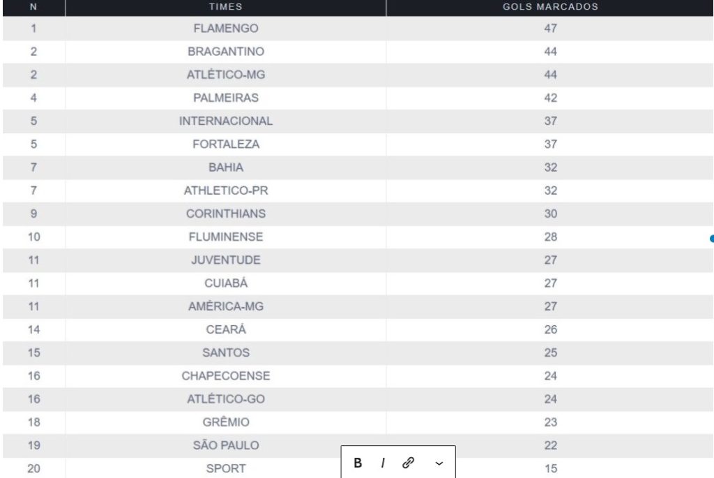 No entanto, a tabela mostra quais são os times que estão com o melhor ataque e estão na parte de cima da tabela atualizada pelo site de UFMG, com todos os números na íntegra. Principalmente, as equipes que estão na luta pelo título, no G-6 e também por uma vaga na Copa Sul-Americana.