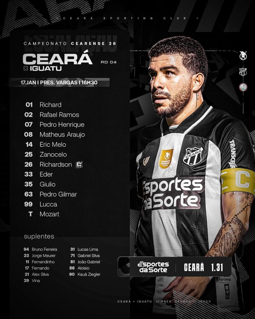 O Ceará está prestes a entrar em campo pela quarta rodada do Campeonato Cearense 2026 e tem o Iguatu como o seu próximo adversário da temporada e da competição. A expectativa é de um jogo de alta intensidade no Estádio Presidente Vargas e o técnico Mozart vai utilizar aquilo que possui de melhor à disposição em busca da vitória.