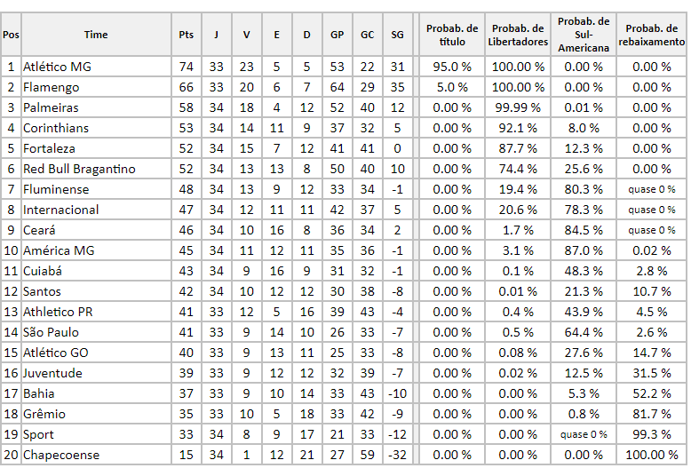 Com o término da 34ª rodada da Série A do Campeonato Brasileiro, o site chancedegol atualizou todas as probabilidades das equipes que estão na luta pelo título da competição, por uma vaga no G-6, para ir na Sul-Americana e também para escapar da zona do rebaixamento.