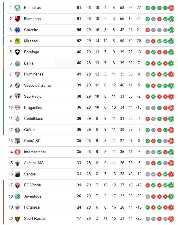 Até o momento, o Alvinegro conquistou nove vitórias, oito empates e sofreu 11 derrotas na atual edição do Campeonato Brasileiro. Agora, o Vozão possui apenas quatro pontos de distância para Santos e Vitória, os times que estão empatados na disputa pela 16ª posição da Série A, com 31.