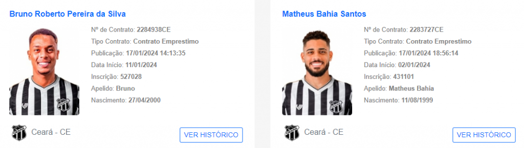 Nesta quarta-feira (17), mais dois jogadores tiveram seus nomes publicados no site da entidade: lateral-esquerdo Matheus Bahia e o meia Bruninho.