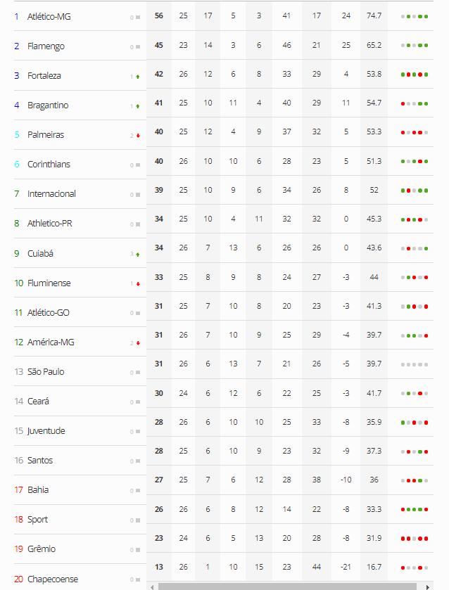 Diante deste cenário, a reportagem mostra na íntegra como está a tabela de classificação atualizada da Série A, com a posição e a pontuação de cada equipe da Série A do Campeonato Brasileiro.