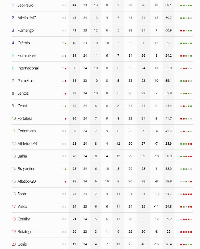 Diante disto, a reportagem mostra a tabela completa e como está a situação de cada time na competição nacional após o encerramento da 24ª rodada da Série A do Campeonato Brasileiro.