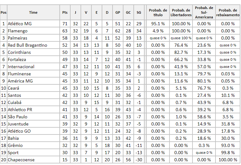 Com o término da 33ª rodada da Série A do Campeonato Brasileiro, o site chancedegol atualizou todas as probabilidades das equipes que estão na luta pelo título da competição, por uma vaga no G-6, para ir na Sul-Americana e também para escapar da zona do rebaixamento.