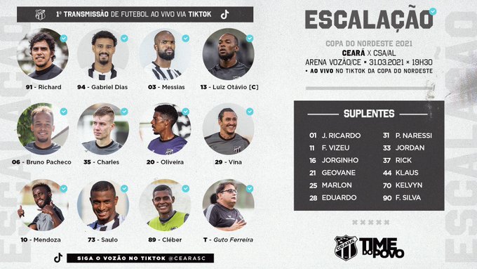 Escalado! Com novidades, Guto define time titular do Ceará para enfrentar o CSA