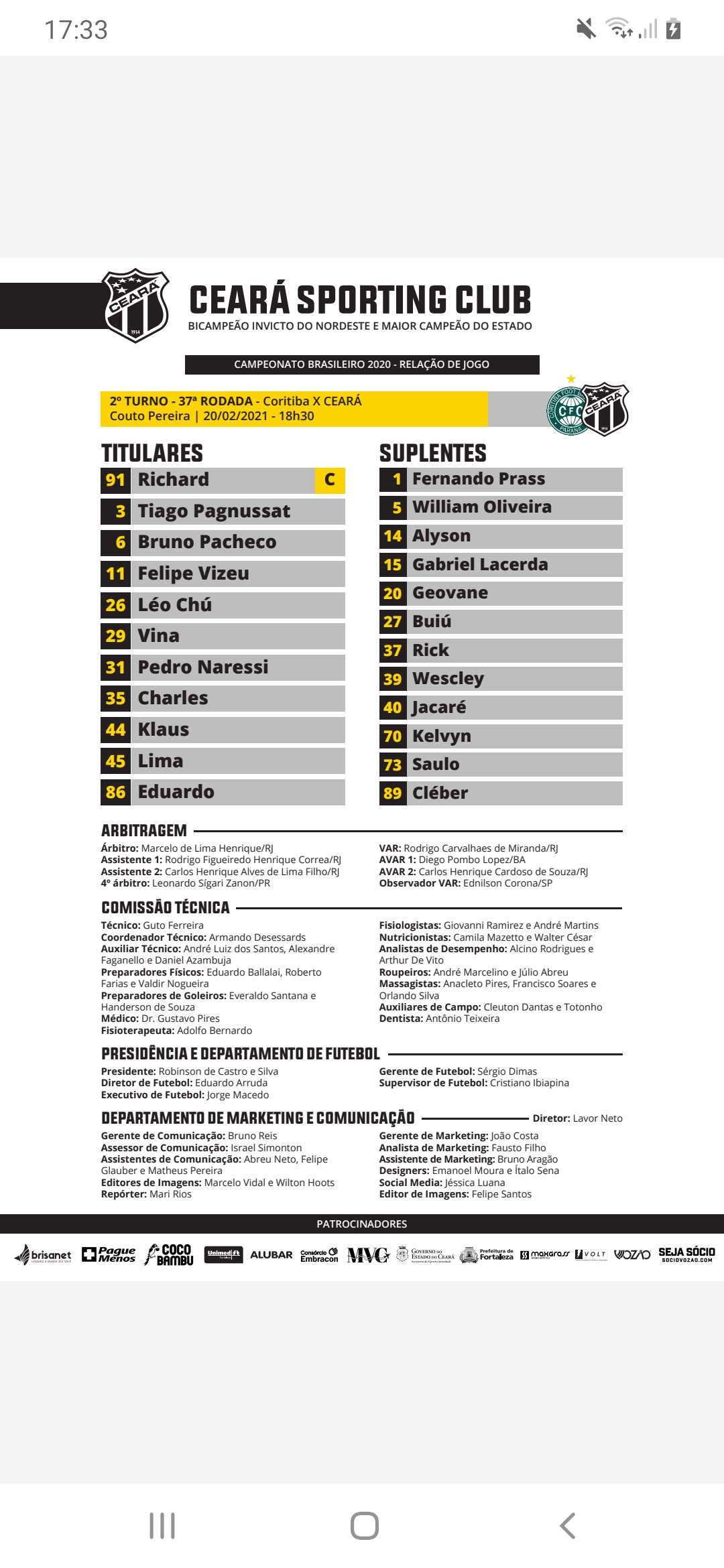 Para o confronto desta noite, o técnico Guto Ferreira confirmou a escalação oficial do Vozão e sem nenhum desfalque, muito menos baixa para o confronto entre Coritiba x Ceará pela penúltima rodada da Série A do Brasileirão 2020/21.