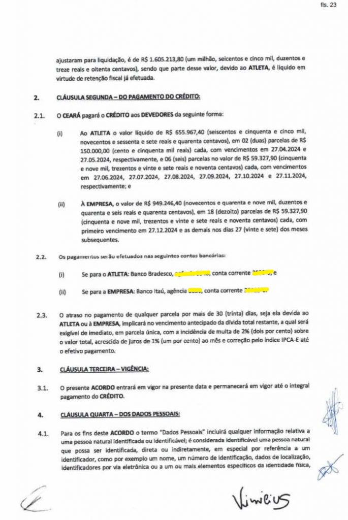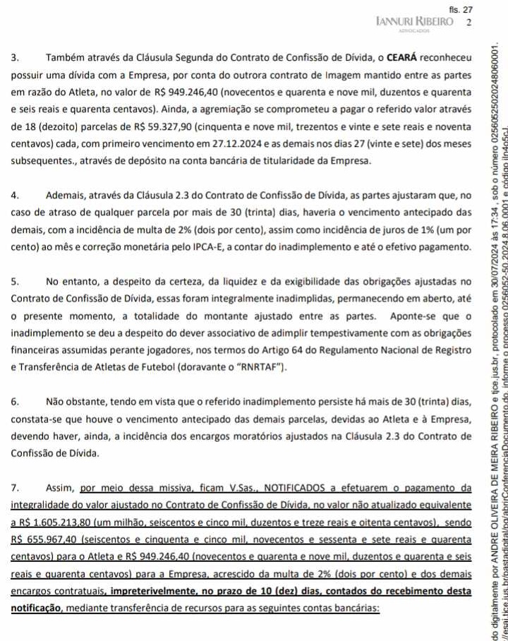 Vale ressaltar que, de acordo com documento de cobrança da defesa, o clube teria assinado um contrato declarando sua dívida e que “no caso de atraso de qualquer parcela por mais de 30 (trinta) dias, haveria o vencimento antecipado de das demais parcelas, devidas ao Atleta e à Empresa, devendo haver, ainda, a incidência de multa de 2% (dois por cento), assim como a incidência de multa de 1% (um por cento) ao mês e correção monetária pelo IPCA-E, a contar do inadimplemento e até o efetivo pagamento“.