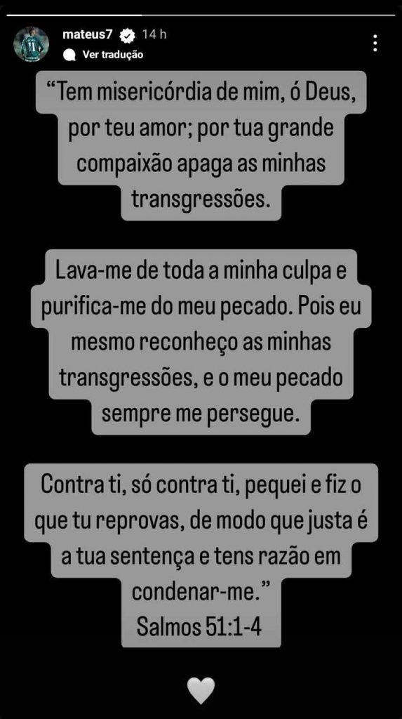 Após viralizar a notícia nas redes socais, o atacante se pronunciou. Por meio do Instagram, Mateus utilizou passagens do livro de Salmos, da Bíblia, falando sobre ter pecado e pedindo perdão a Deus.