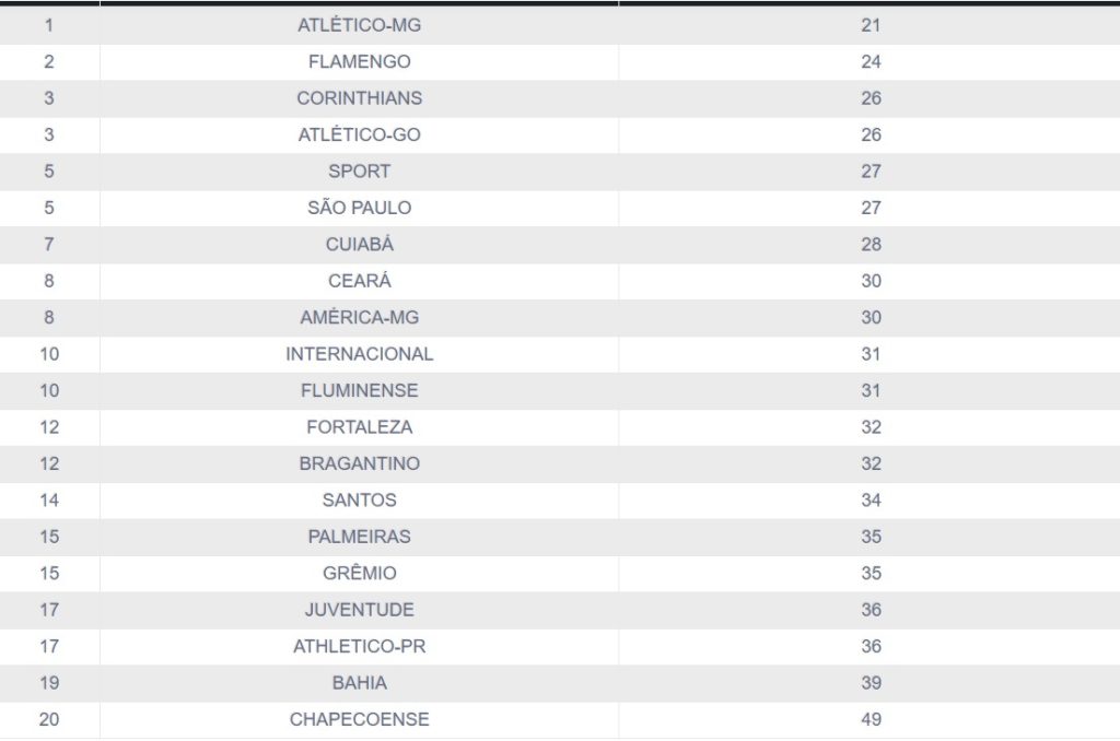 Com isso, a reportagem mostra na íntegra a tabela dos times que estão com as piores defesas e também as melhores, após o término da 29ª rodada da Série A do Campeonato Brasileiro.