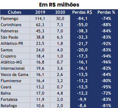 Os clubes mais afetados foram Flamengo, Corinthians, Palmeiras e São Paulo. A equipe carioca teve perda de R$ 84 milhões, enquanto o Timão apresentou queda de 55 milhões, o Verdão de 45,3 e o Tricolor de 32,3. O Santos foi o sexto colocado da lista, com perda de 20 milhões de reais.