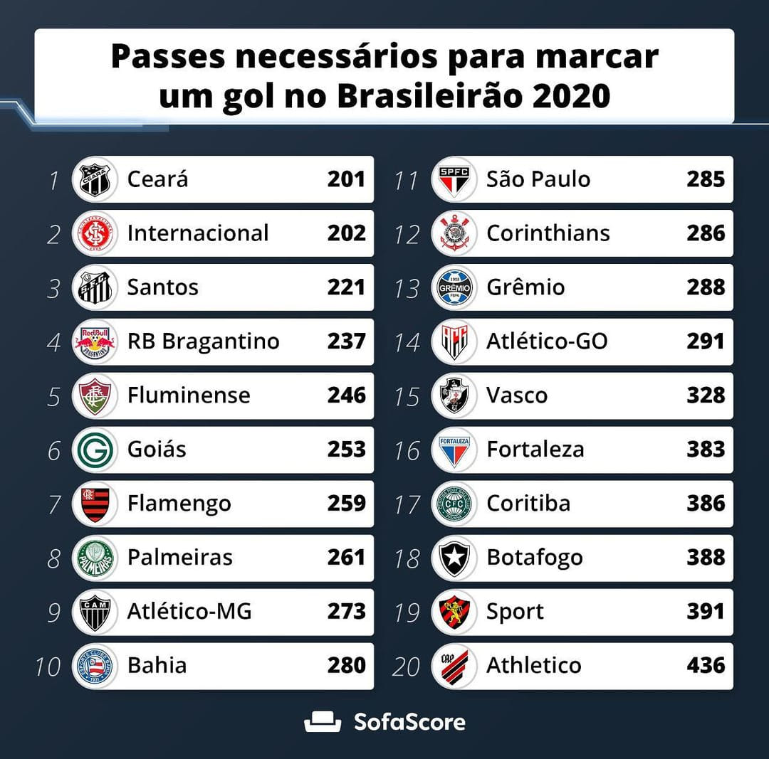 Na sexta colocação está o Goiás com 253 passes necessários para gols no Brasileirão. Por fim, o Sport na 19ª colocação com 391 passes para marcar um gol.