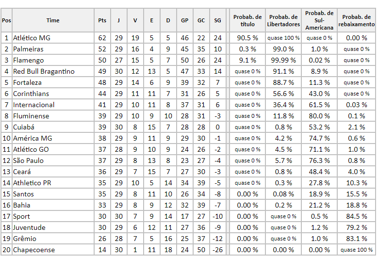 O site chance de gol trouxe uma atualização com relação as chances e probabilidades de cada equipe na Série A do Campeonato Brasileiro, após o término da 29ª rodada da competição nacional.