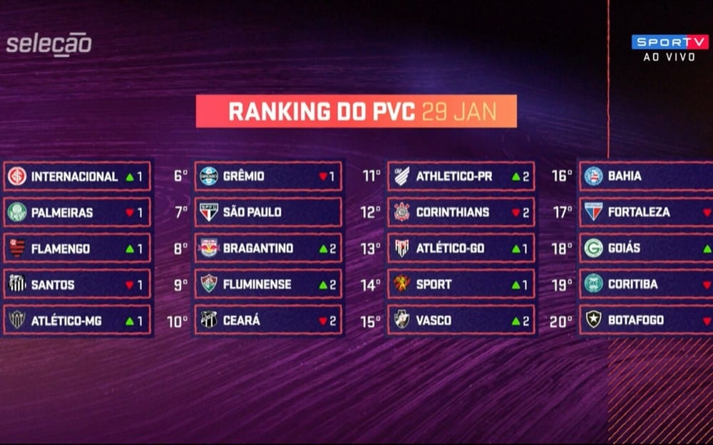 Nesta sexta-feira, o jornalista Paulo Vinicius Coelho atualizou o seu ranking no programa do Seleção SporTV, no canal do SporTV após os jogos do Campeonato Brasileiro que ocorreu no último final de semana e também com as partidas atrasadas durante esta semana.