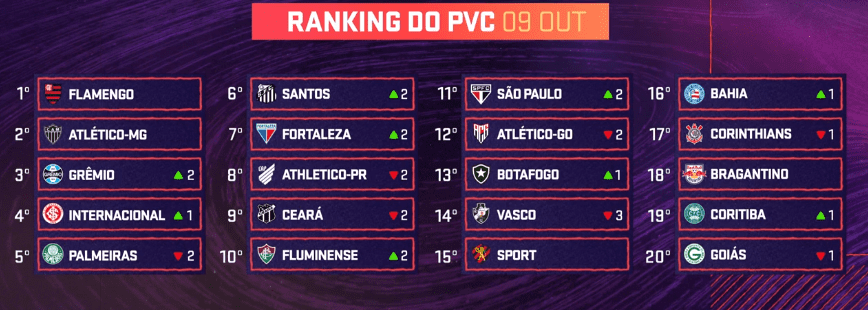 A grande mudança no ranking, que é comandado pelo jornalista é o Corinthians tr entrado na zona do rebaixamento por causa dos resultados e agora está na 17ª colocação. Já o Flamengo segue na liderança do rankinh, seguido logo atrás pelo próprio Atlético-MG.