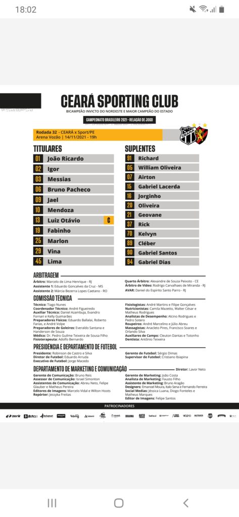 Nesse sentido, o Ceará divulgou a escalação oficial para o duelo: