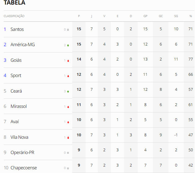 Com a vitória por 2 a 1 de virada – gols foram marcados por Facundo Barceló, de cabeça, e Saulo Mineiro, de pênalti nos acréscimos – sobre a Chape-SC, o Vozão foi aos 12 pontos e subiu três colocações, indo agora para o quinto lugar. Com isso, o Alvinegro tem a mesmo pontuação que o Sport-PE, quinto colocado, um ponto a mesma que o Goiás-GO, na terceira posição, e três a menos que o líder e vice-líder, Santos-SP e América-MG.